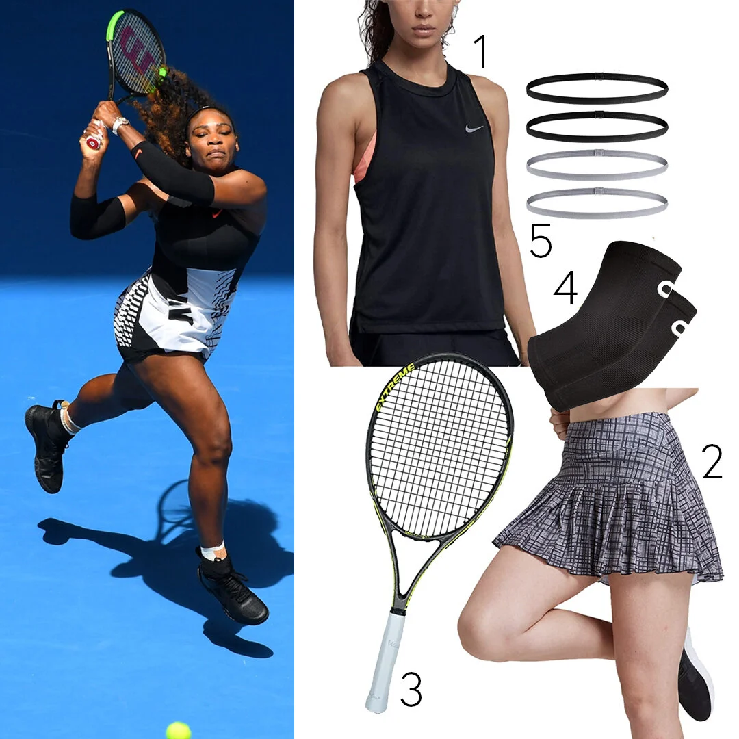 While we applaud you for getting out of bed (especially in that first trimester), you can harness your inner athlete with this sporty getup: 1) sponsored Nike tank, 2) fashion-forward tennis skirt in quick-dry fabric, 3) tennis racket with a necessary touch of neon, 4) compression sleeves, 5) no-frills headband. BYO trophy.