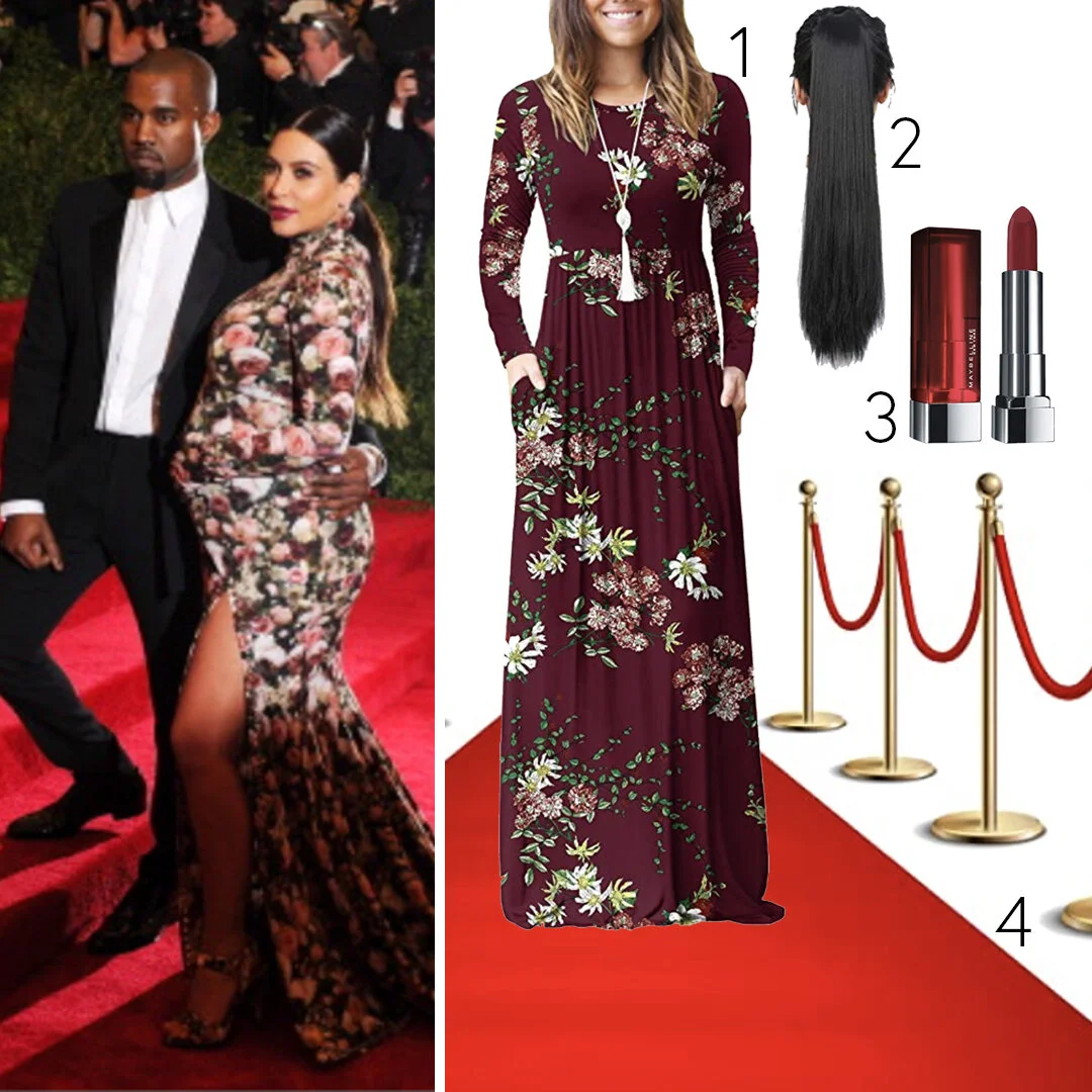 Rolling into the 2013 Met Gala with husband Kanye West, Kim Kardashian West wowed in a symbolic floral ensemble. DIY a controversial red carpet moment at home with 1) the dress, of course (size down to get the fit), 2) wine colored lipstick, 3) an extra long ponytail, and 4) your very own red carpet — which you deserve, even if no one else will see.